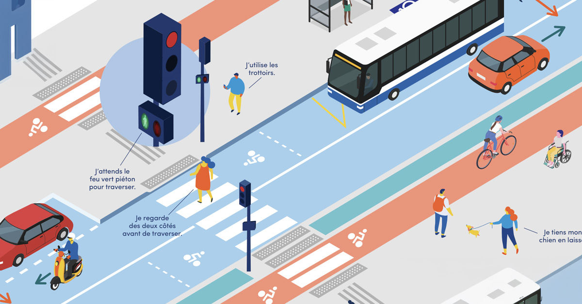 Les aménagements et les règles visent à favoriser une meilleure cohabitation entre : piétons, cyclistes, automobilistes, trottinettes et autres mobilités.